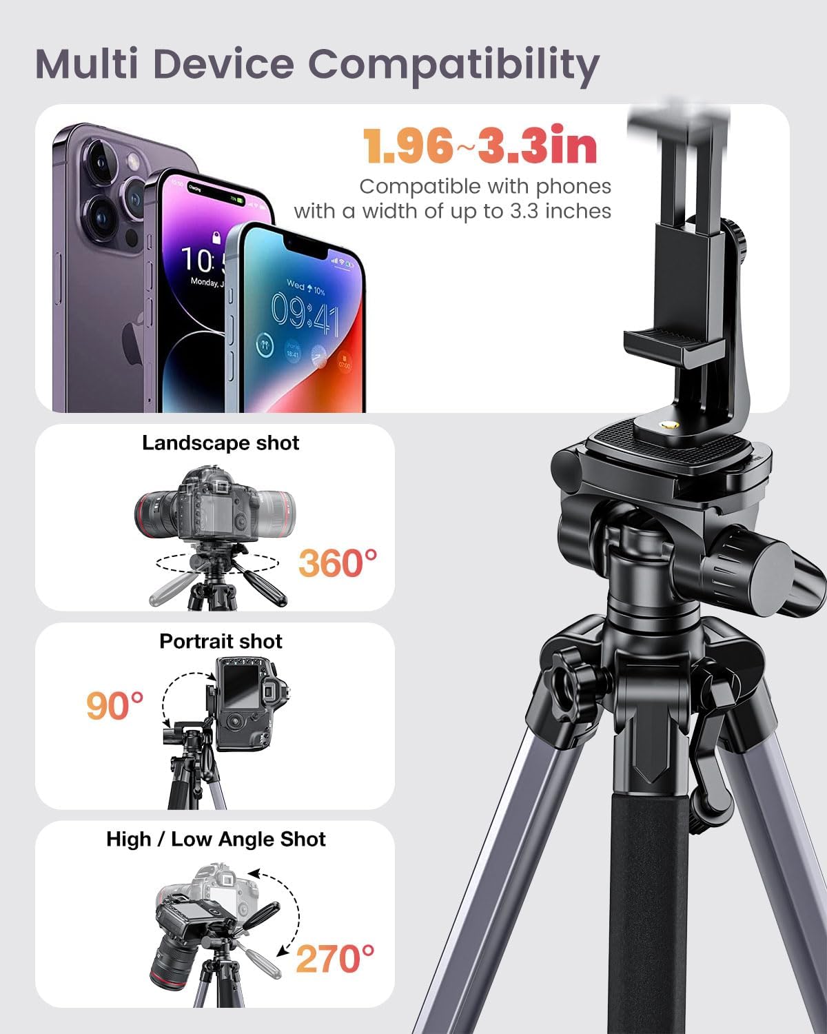 With a maximum height of 74 inches, this tripod allows you to shoot from a variety of angles and perspectives. The adjustable legs and quick-release plate ensure stability and easy setup, while the built-in phone holder allows you to easily attach your smartphone for remote shooting or live streaming.